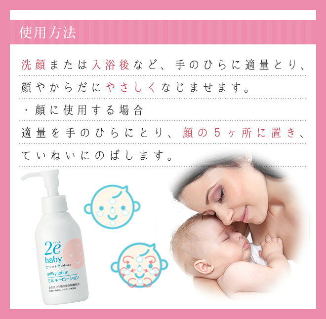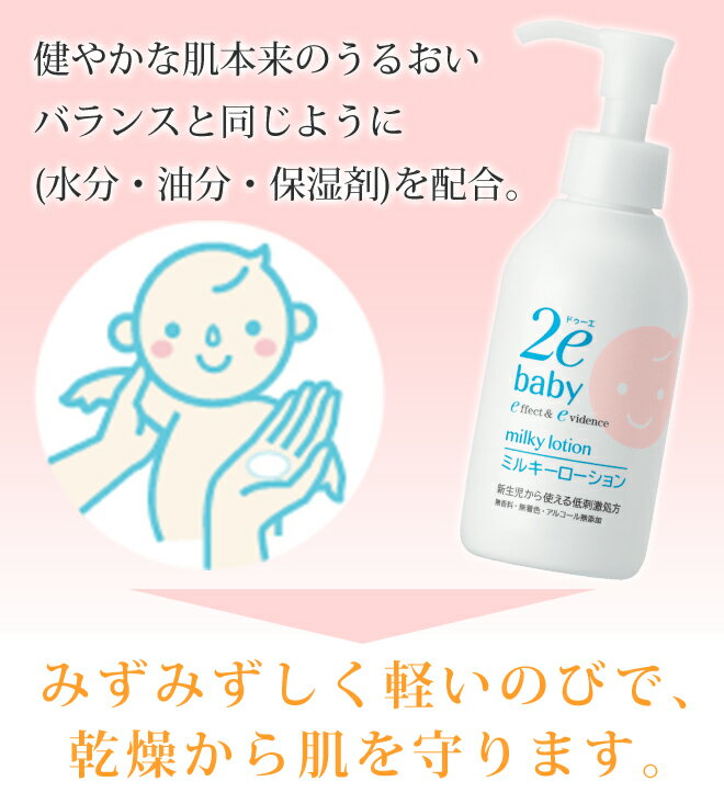 ブランド ドゥーエ ベビー 商品名 / 内容量 ミルキーローション 150ml 説明 ●みずみずしく軽いのびで、乾燥から肌を守ります! 「2e Baby Plus(ドゥーエ ベビー) ミルキーローション 150ml」は、赤ちゃんの肌を乾燥から守りうるおいをキープ。