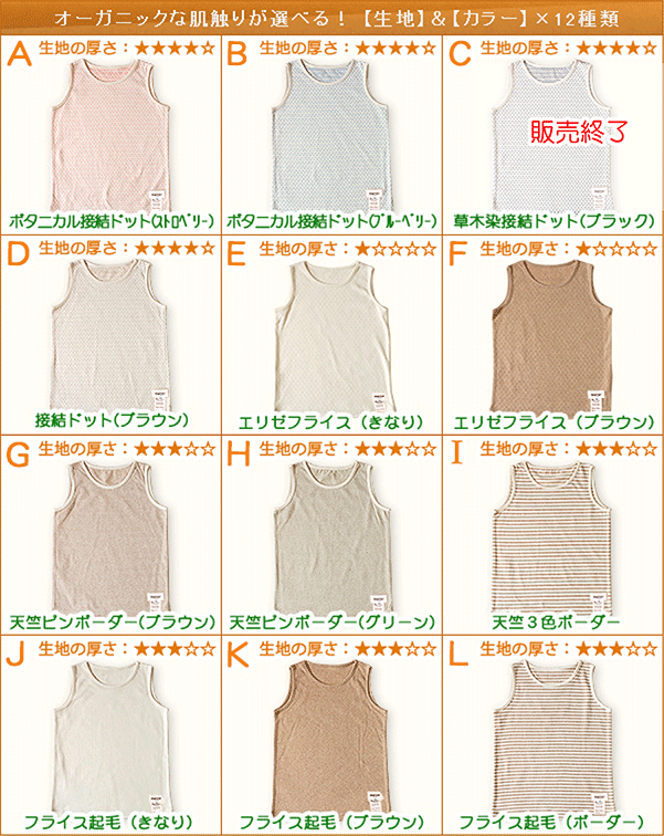オーガニックコットン製の肌着で、ここまで生地を選べる商品は、他店に無いと思います。